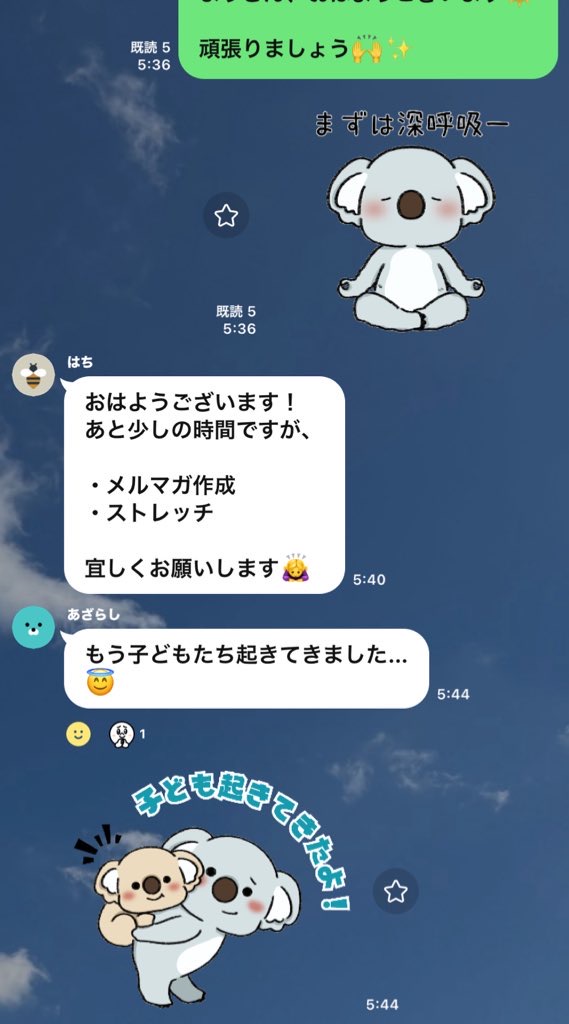 「今日は頑張った!」という報告にコアラスタンプを送り合ったり、ちょっとした雑談をしたり、和やかな雰囲気で朝時間を過ごしています。